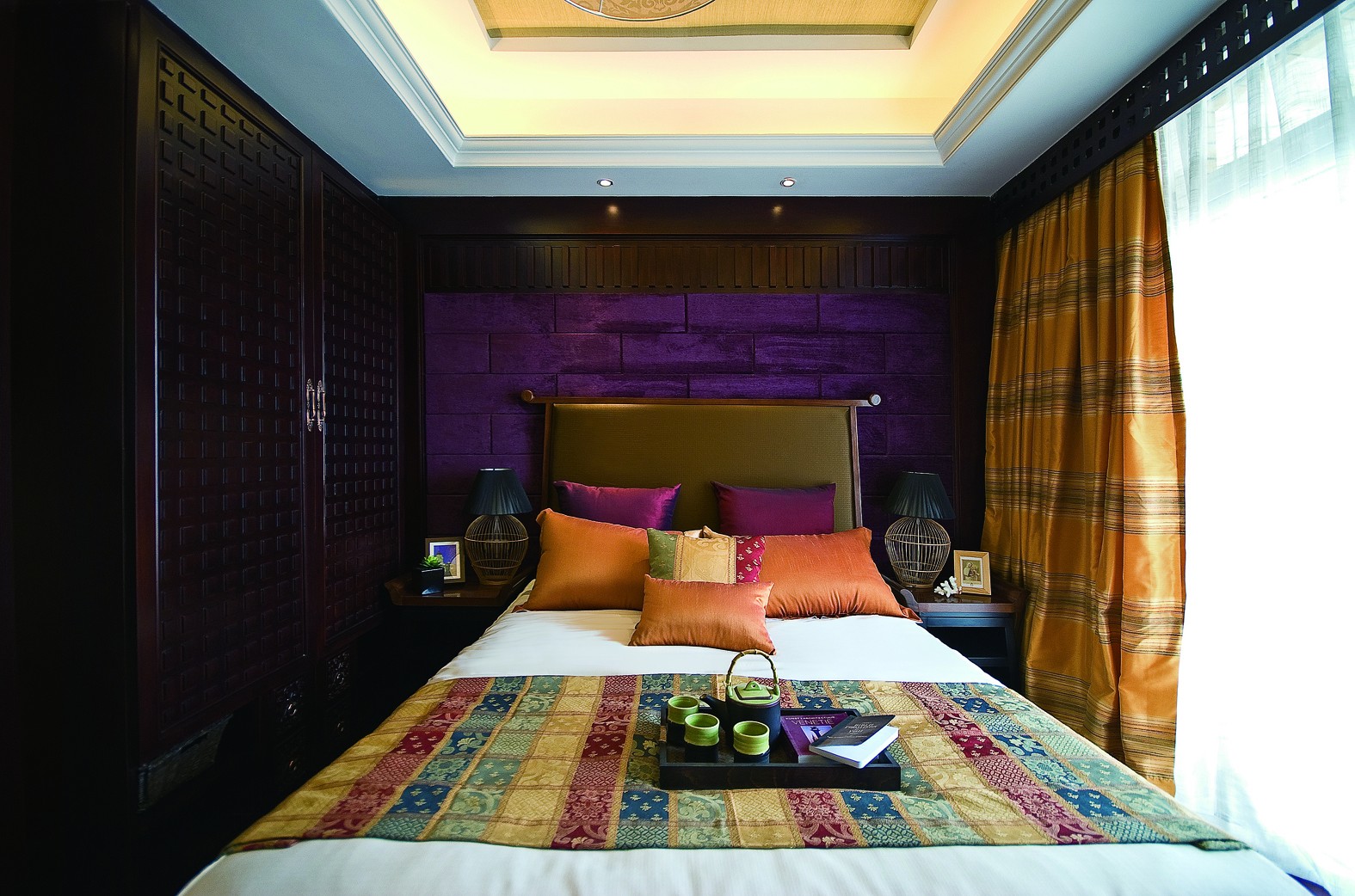 运用木材和其他的天然原材料,如藤条、竹子、石材、青铜和黄铜,深木色的家具,局部采用一些金色的壁纸、丝绸质感的布料,灯光的变化体现了稳重及豪华感