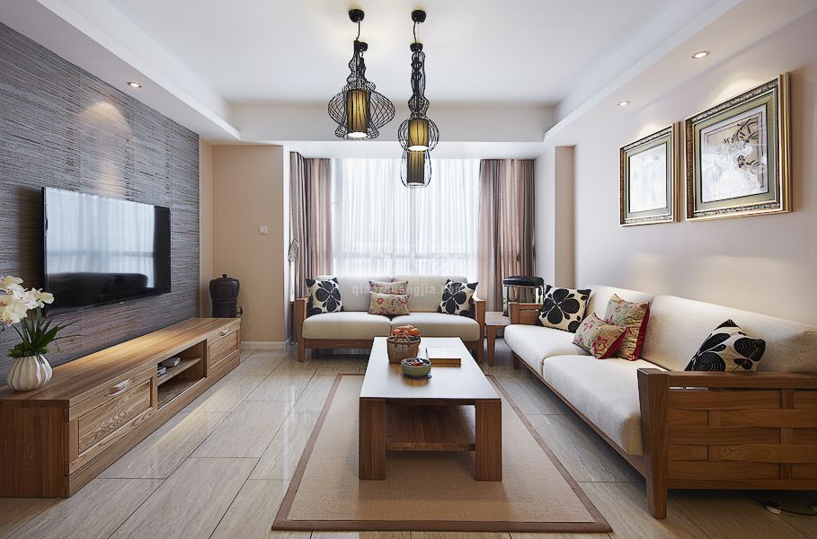 新中式风格,特别的灯具选择,家具的选择也是既时尚又不失中式的传统元素,正好符合业主的需求,别致,新颖。还有一进门的墙面独特设计,给人一种明快的感觉。电视墙的设计大气而不是庸俗,客厅也是比较长待的地方,所以整体的设计感觉都以休闲为主,也突显出新中式独特风格.