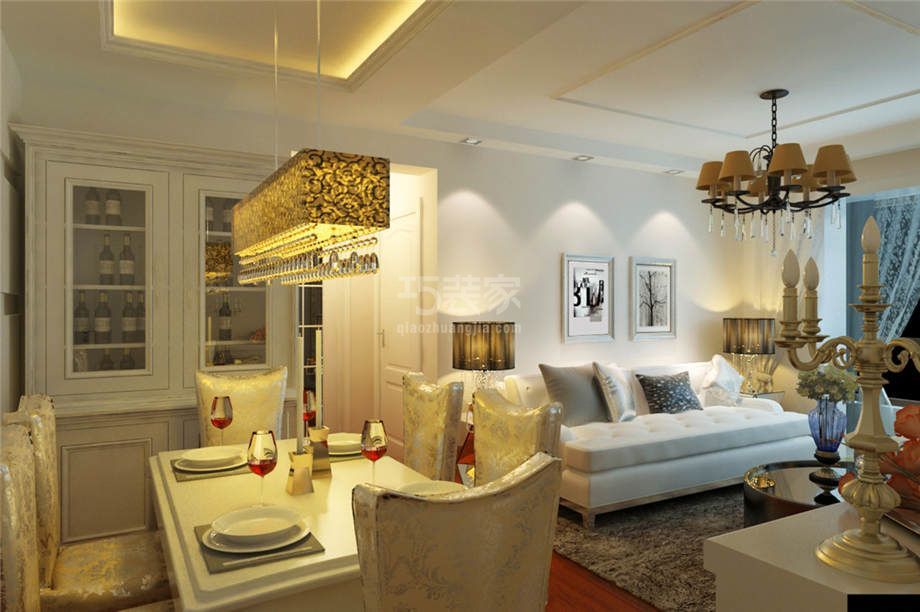 整体的风格是根据通过和客户充分沟通来确定的,由于客户都是充满活力的青年阶层,家具比较喜欢略带些欧式样式的,也比较喜欢欧式里面的设计元素,所以整体风格定型为简欧风格。    由于空间不是特别大,再根据客户的喜好,整体以高明度的色彩来装饰,在电视背景和床头背景出采用了一些跳跃的色彩来搭配,突出背景墙的装饰性,入户后首先是分隔出来的一块餐厅的区域,由于空间的限制餐桌放在这还是比较合理的,在靠里侧的墙边放置了一组欧式的酒柜,集使用和装饰一体,电视背景墙上由于有道厨房的门,所以背景墙的尺寸就有所限制了,整体是一个倒U字的设计,咖色的镜面四周用浅啡网纹石材包边,中间与一款高贵典雅的壁纸相搭配形成了客厅里的一个亮点。顶面通过采用分隔的手法区分出来了客厅和餐厅的两个空间。