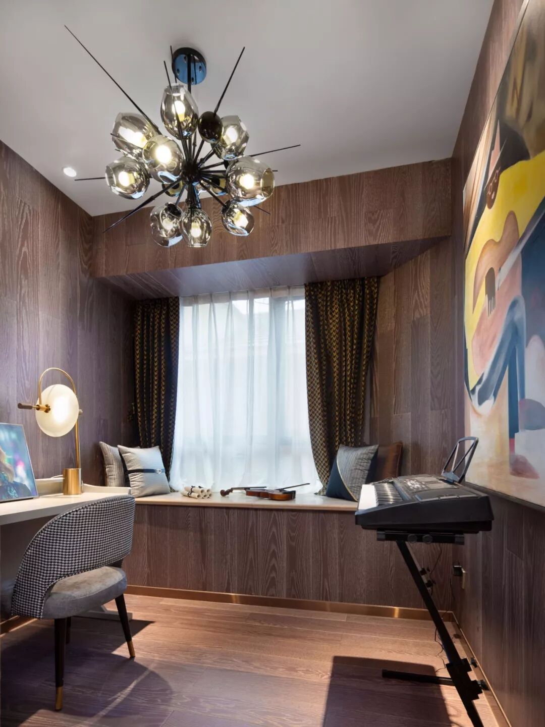 ▲书房整个空间都被木饰面包围,布置上书桌与一架电子琴,呈现出一个华丽端庄的档次与温馨。