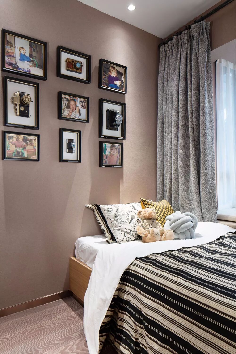 ▲次卧靠窗布置床铺,粉咖色的墙面挂了一组照片墙,搭配条纹床单,使得空间现代而又时尚。