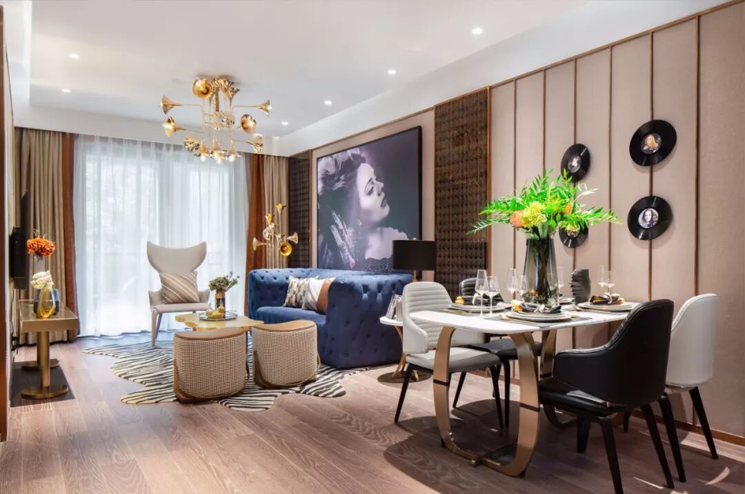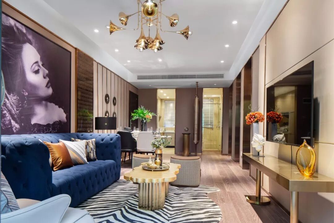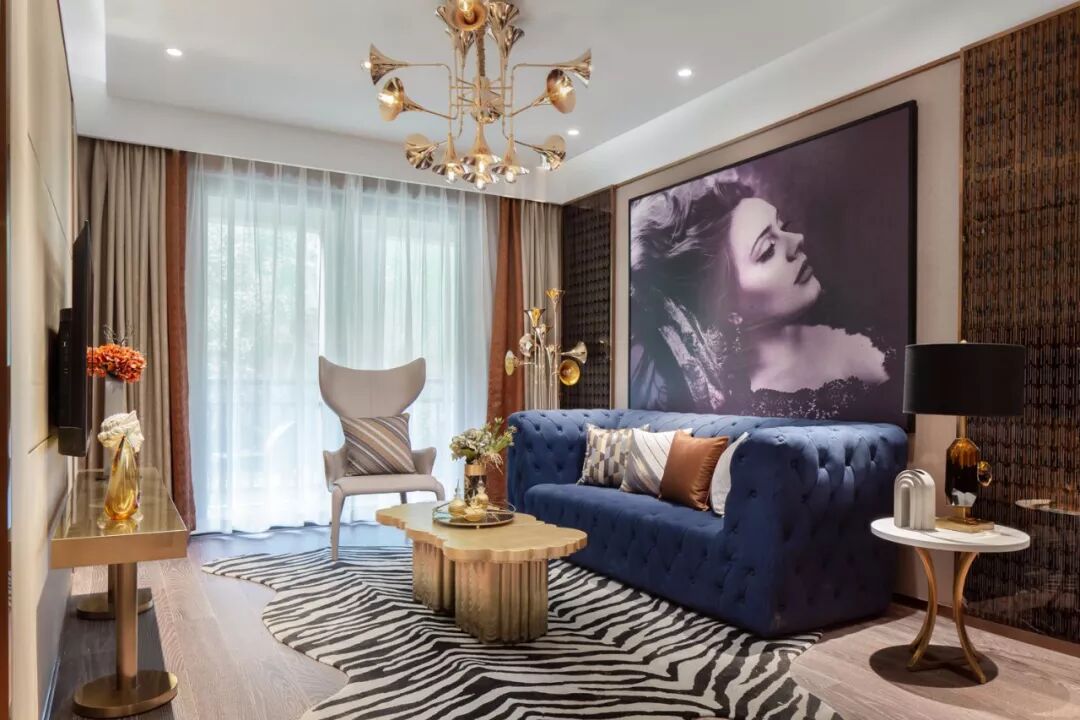 导语:整体家居风格以优雅的轻奢古典范为主,沙发墙是一整幅时尚的女神挂画,搭配一张蓝色的复古调沙发,斑马纹的地毯,还有轻奢复古调的茶几与边几,整个空间充满了典雅端庄的华丽感。