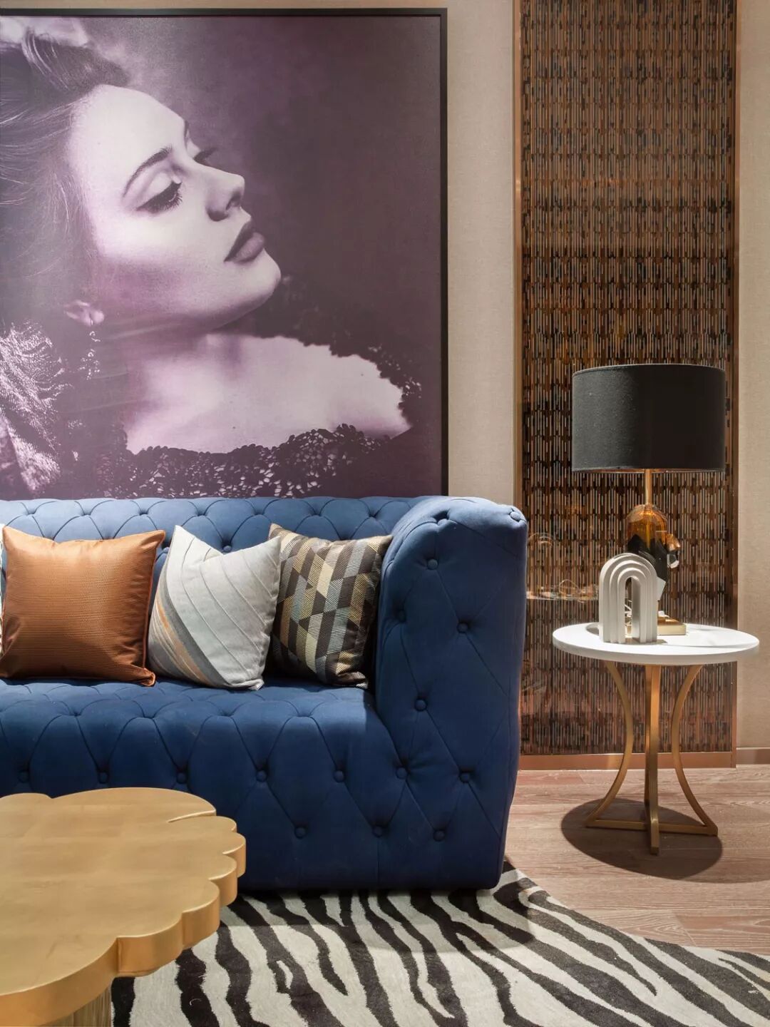 ▲客厅整体家居风格以优雅的轻奢古典范为主,沙发墙是一整幅时尚的女神挂画,搭配一张蓝色的复古调沙发,斑马纹的地毯,还有轻奢复古调的茶几与边几,整个空间充满了典雅端庄的华丽感。