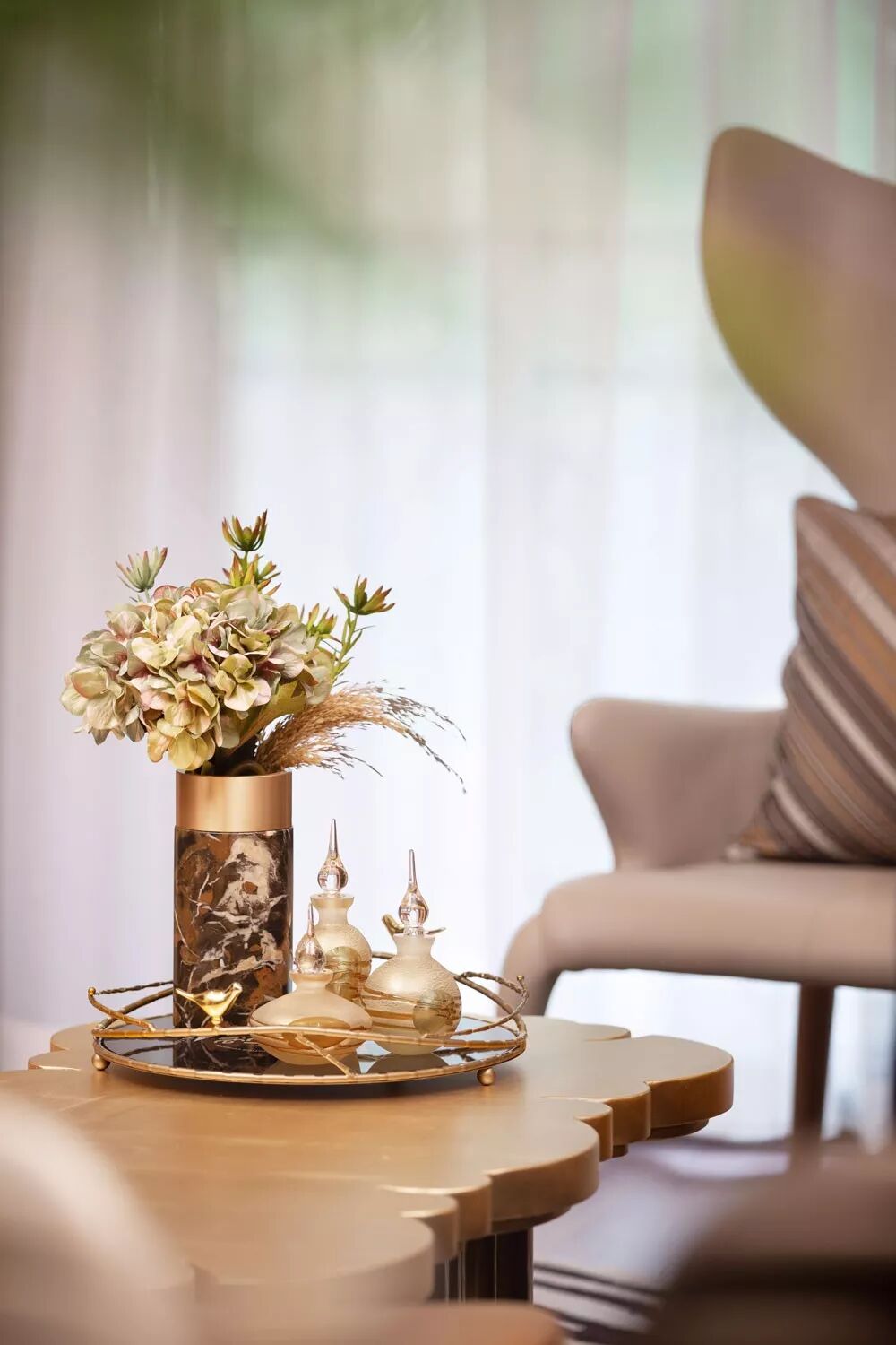 ▲边几与茶几上的花瓶与台灯、陶艺品,也在不经意间增添了空间的华丽感。