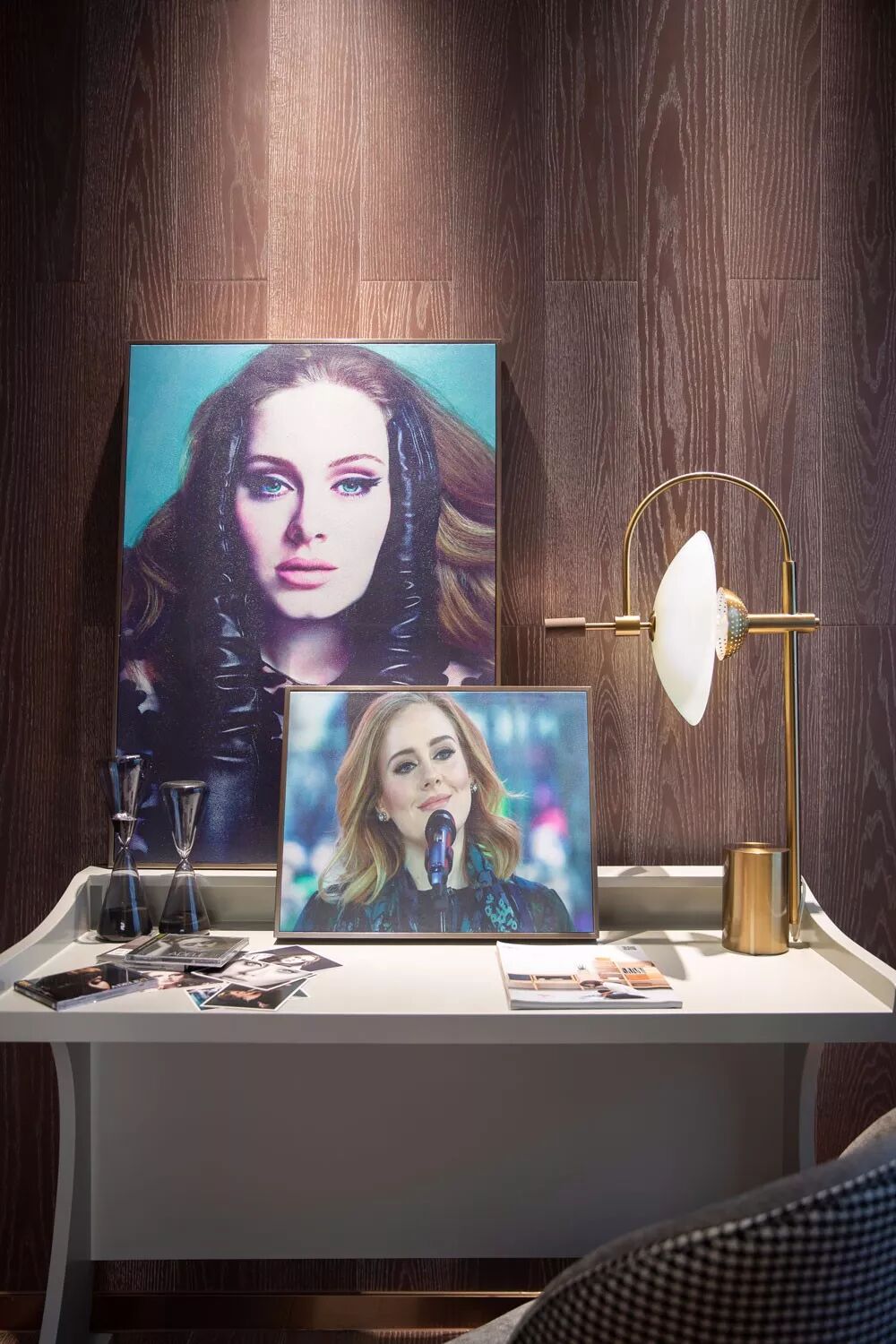 ▲书桌上的时尚女神,搭配一盏铜色台灯、两个玻璃罩沙漏,充满着时尚优雅的气质感。