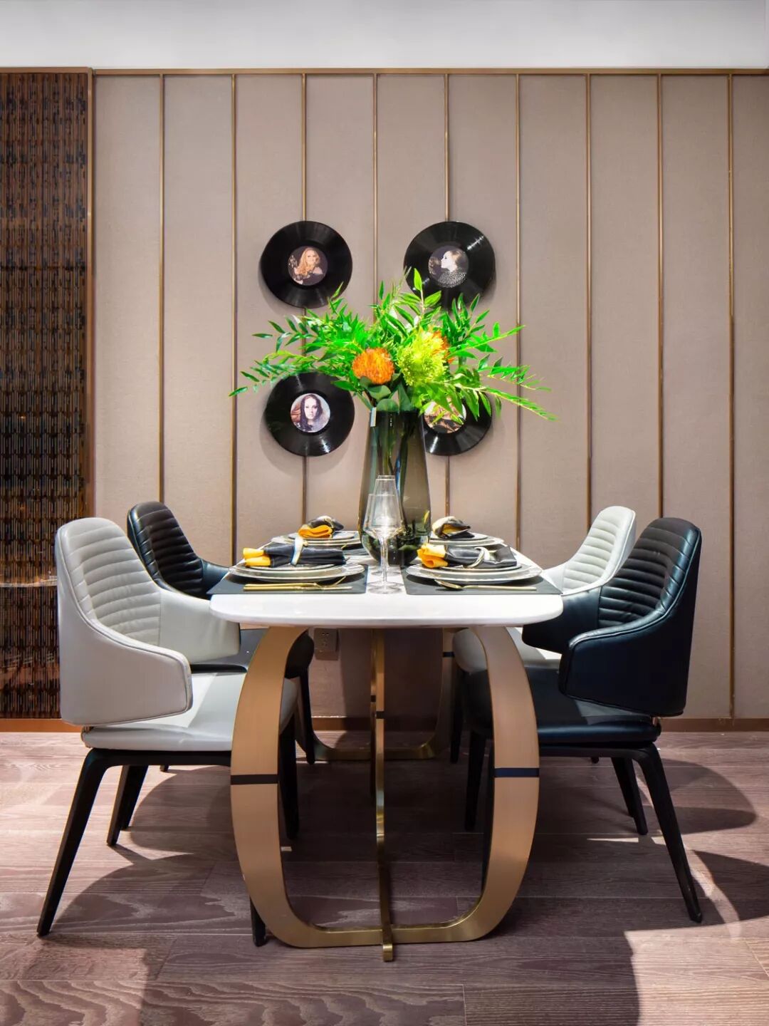 ▲沙发墙与餐厅背景墙中间的是金属背景,摆上边几与台灯布置,显得华丽而档次。而轻奢风的餐桌+黑色脚的皮艺餐椅,结合台面上精致的餐具与花瓶摆饰,营造出一种华丽端庄的档次。