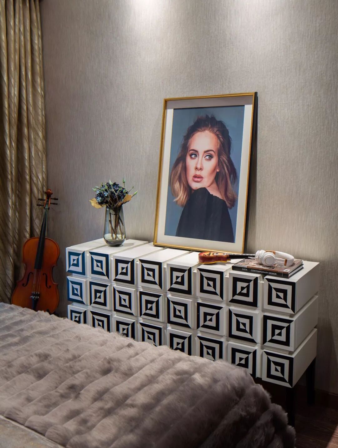 ▲床尾是一张黑白配的床尾斗柜,回字格子的图案,上边摆上一幅女神照片,带来的是一种现代优雅的时尚感。