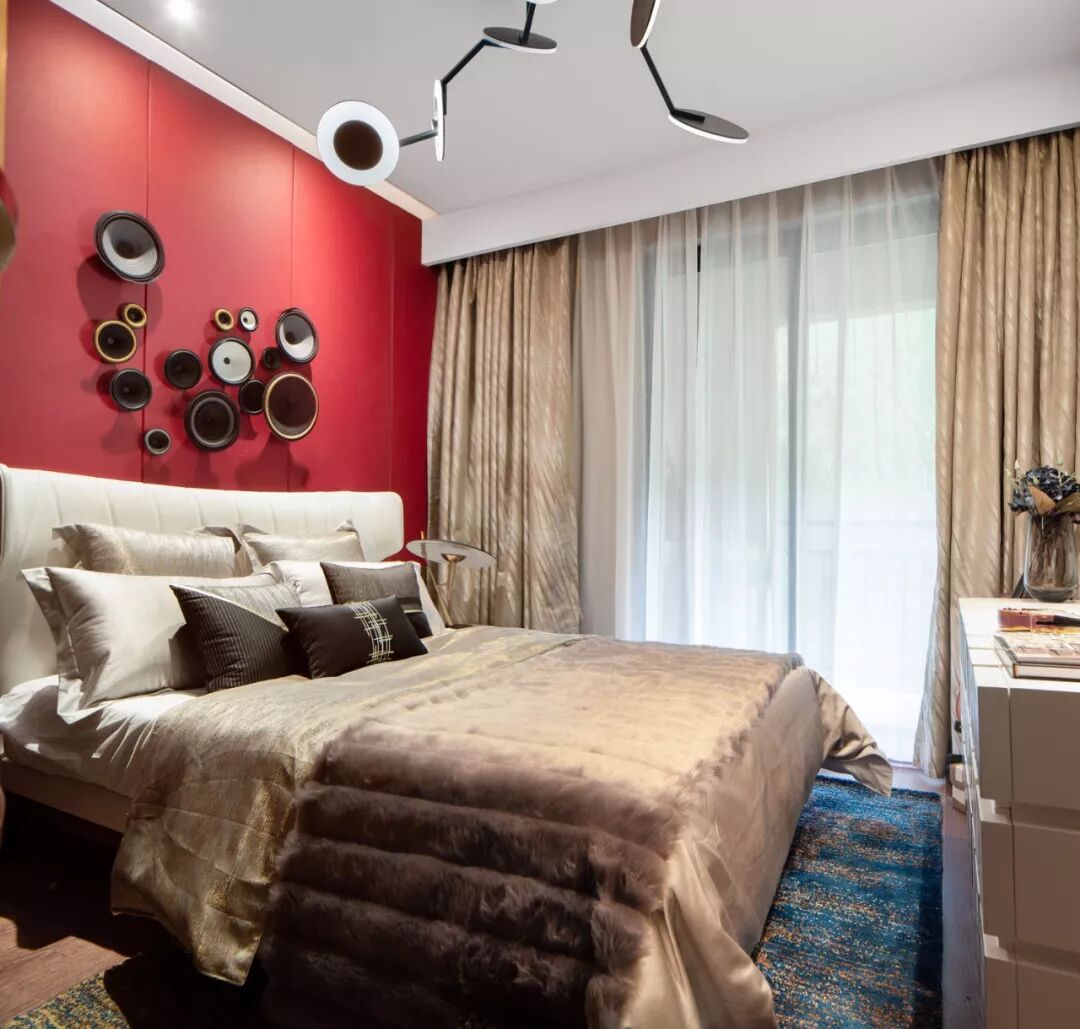 ▲卧室床头墙以大胆的红色背景,挂上一组喇叭造型墙饰,蓝地毯+咖色床铺。呈现出一个安静、温馨与热情兼备的氛围感。