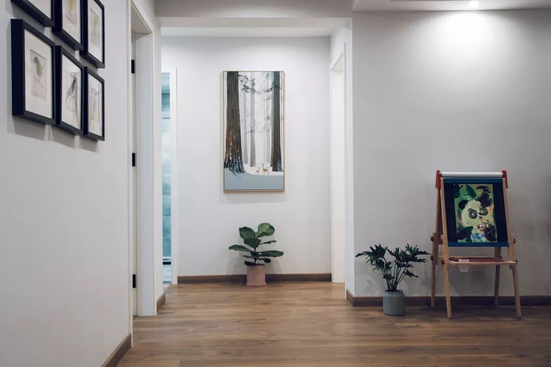 ▲玄关对着走廊的空白墙面,挂一幅森林画面的竖幅装饰画,地上一盆小琴叶榕,让空间显得格外的清新雅致。
