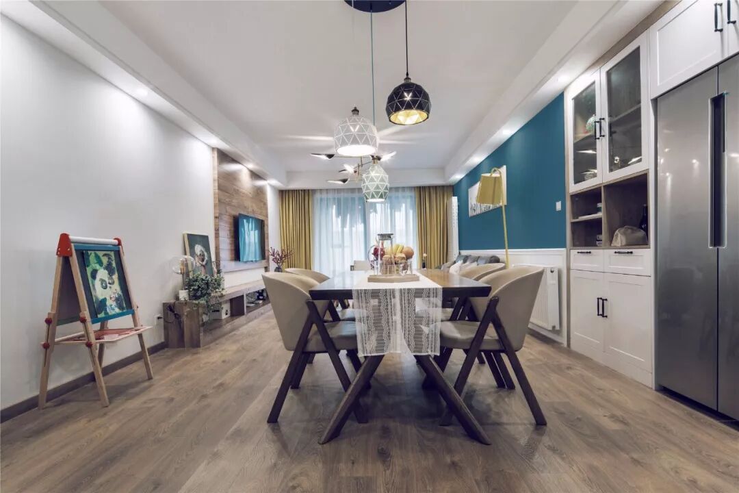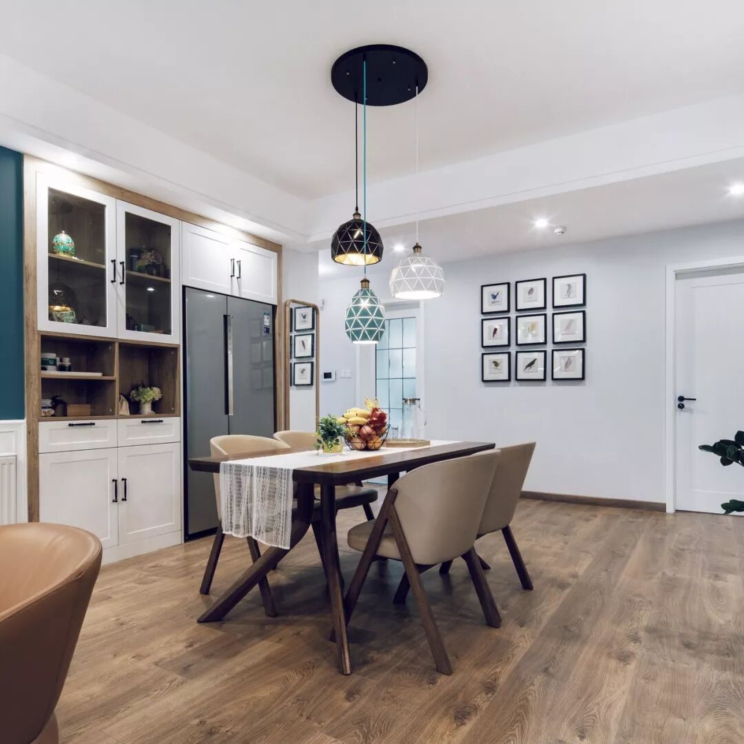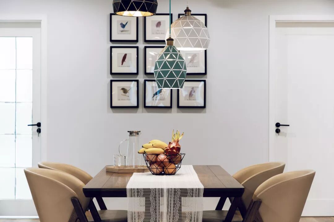 ▲墙面的九宫格鸟儿装饰画,黑白蓝的创意吊灯,也让餐厅显得更加精致活泼有趣。