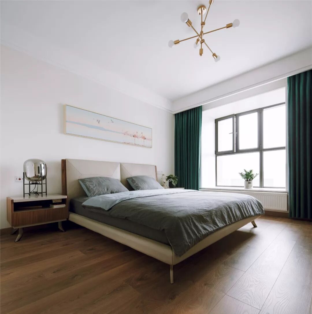 ▲简雅色调的卧室,在床头墙挂上一幅火烈鸟在水边的横幅画,再布置上舒适的皮艺床+灰色床单,搭配上墨绿色的窗帘,让空间简约舒适而又档次沉稳大气。