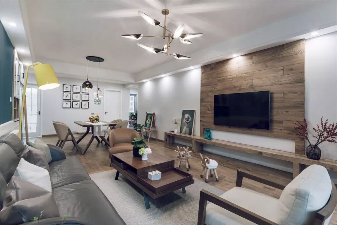 ▲电视墙在木质背景的基础,电视柜是一个大板的木质定制,还摆上了精致餐椅的小饰品,让空间视觉显得自然也有和谐大气。