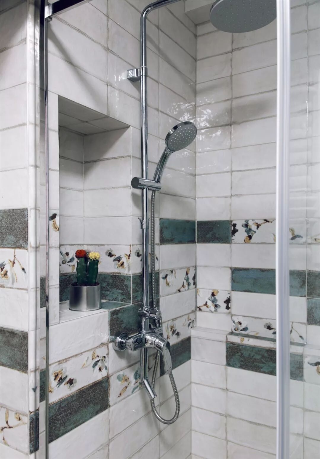 ▲卫生间在白色墙面砖的基础,乱入了一些复古青色与花鸟图案的墙砖,淋浴花洒旁边还有一个壁龛,卫浴用品可以方便地收纳上去。