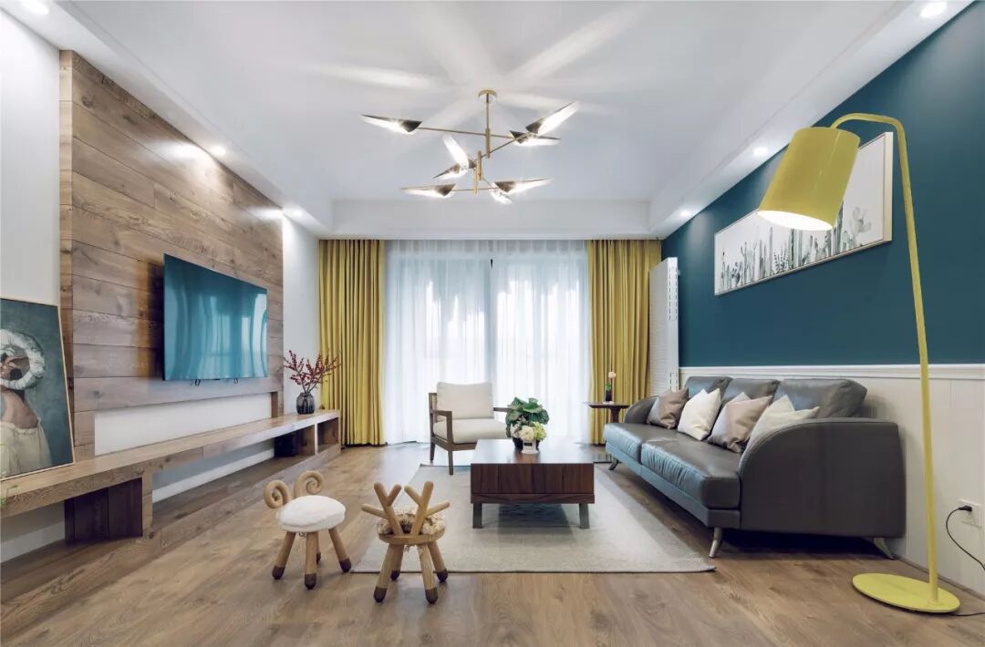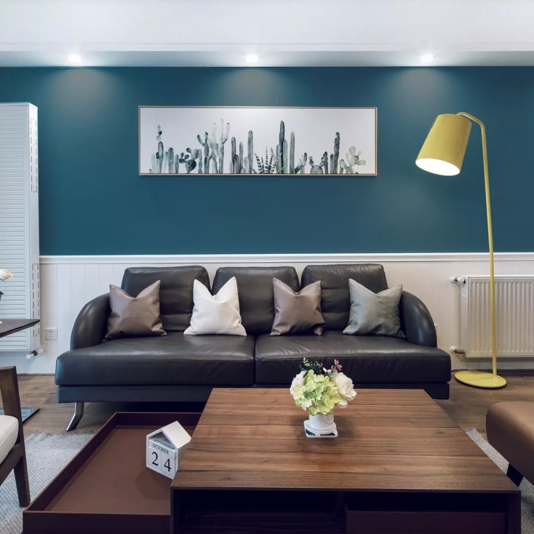 ▲沙发墙以护墙板为墙脚,墙身刷成蓝色的乳胶漆,挂上一幅仙人掌的横幅装饰画,搭配黑色皮沙发,还有边上的黄色落地灯,布置出一种活力简约的档次感。