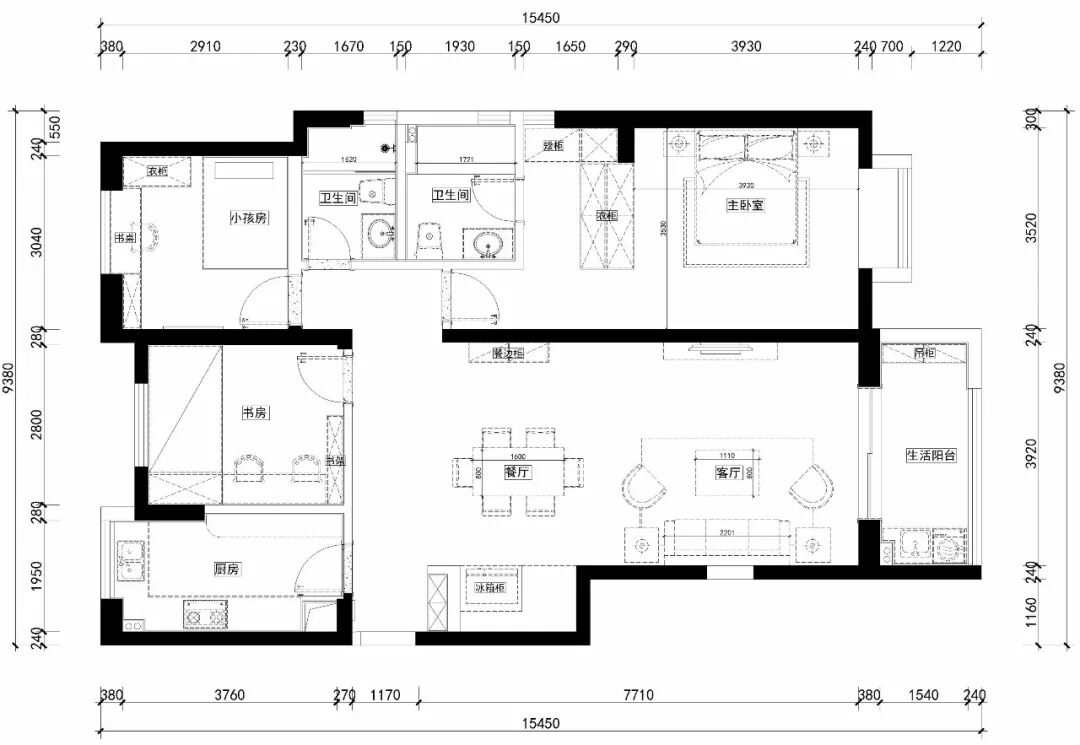 ▲餐厅侧边的墙面定制了一个入墙式的餐边柜,冰箱也嵌入到里面,整体空间感简洁自然,布置上胡桃木的餐桌,皮艺坐垫的餐椅,让用餐体验精致舒适而端庄大气。