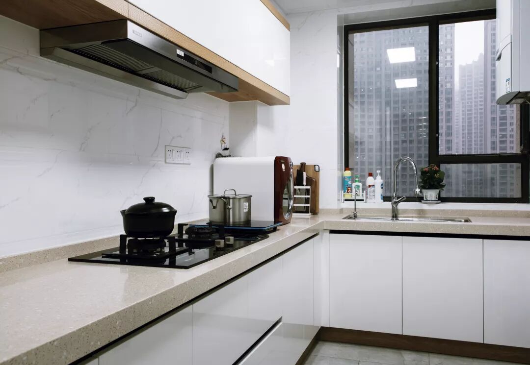 ▲雅白的墙面砖,搭配上白色的定制橱柜门,厨房空间实用自然为主。