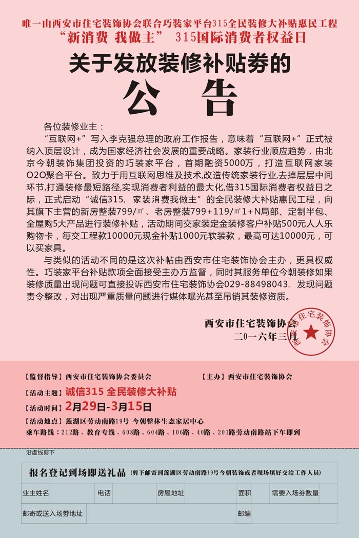 (3)补贴仅限西安地区业主,截止时间2016年3月15日下午20:00。
